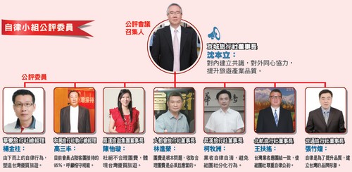 ▲旅行公會全聯會與精品產業協會舉辦【提升陸客來臺旅遊品質 觀光業者自律】座談會。與談人中華觀光精品產業協會總監陳應俊(左起)、台灣接待陸團地接社自律委員會會員代表沈本立、中華觀光精品產業協會理事長張雅琍、中國時報副社長張景為、旅行商業公會全聯會理事長姚大光、台灣接待陸團地接社自律委員會會員代表高三丰、中華觀光精品產業協會常務理事劉昶甫、資深導遊代表黃世舜。