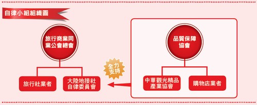 身為掌控陸客來台旅遊品質要角的地接旅行社,以旅客團費與購物店佣金為主要收入來源,相對地團費價格的競爭,亦增加了購物店的壓力。為了打造台灣優質旅遊環境,由業者發起的自律委員會透過「制定基本收費制度」、「與中華觀光精品產業協會、購物店業者達成共識」,制定了相關的條約與規範,達到相互制衡的效果,進而讓旅行社業者與旅客的權益有所保障。