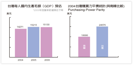 行政院主計處公布台灣每人國內生產毛額 (GDP)數字,三年數字分為為2004年14,271美元、2005年15,215美元、2005年15,215美元,GDP數字與南韓相近。但就「購買力平價」(Purchasing-Power Parity)評比,依國際貨幣基金會 (IMF)計算,2004年台灣購買力平價為24,676美元,南韓18,686 美元,台灣超越南韓5,990美元,顯見台灣人消費力之雄厚!