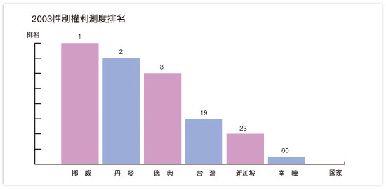 2003年UNDP共評比全球80個國家,GEM值排名前3名分別為挪威、丹麥及瑞典,顯示這些國家女性較積極且有較廣闊機會參與政經決策。台灣GEM值位居第19名,在亞洲國家中領先新加坡23名、日本44名及南韓60名,居亞洲之冠。