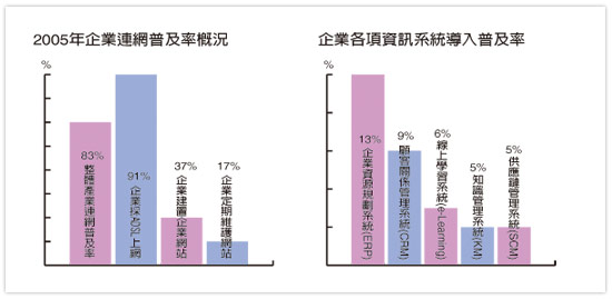 2005年有37%的企業建置企業網站,其中近17%的企業,定期維護網站。另外,2005年產業在各項資訊系統導入的普及率依序為:企業資源規劃系統(ERP)13%、顧客關係管理系統(CRM)9%、線上學習系統(e-Learning)6%、知識管理系統(KM)5%、供應鏈管理系統(SCM)5%。