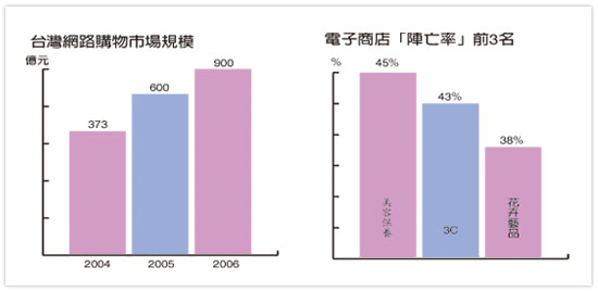 根據資策會台灣地區電子商店調查研究報告,2004年台灣網路購物市場規模389億元,較2003年373億元成長61%,預估今年可達600億元,2006年更將挑戰900億元。 其中,電子商店「陣亡率」超過3成,前三大類型為美容保養、3C 與花卉藝品,相較之下,旅遊與票務陣亡率較低。