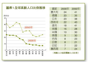 以全球高齡人口比例推移的趨勢來看,從2000年開始,世界各主要國家的老年人口比例都出現逐步增加趨勢,以成長最緩慢的英國來說,人口老化的比例在2050年時也將提升到28%,成長幅度12%,而成長最多的國家是捷克,將有23%的增幅,造成社會福利沉重負擔。