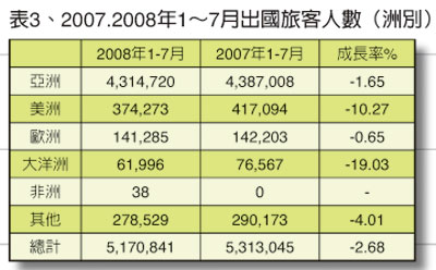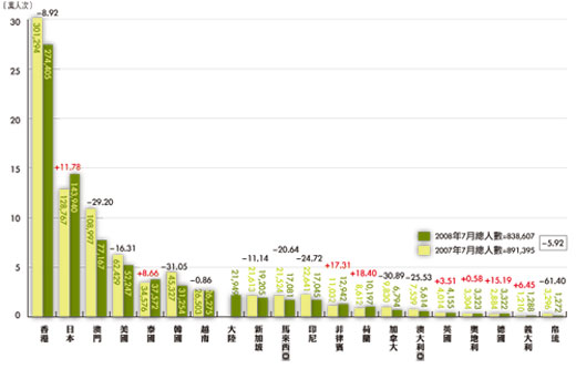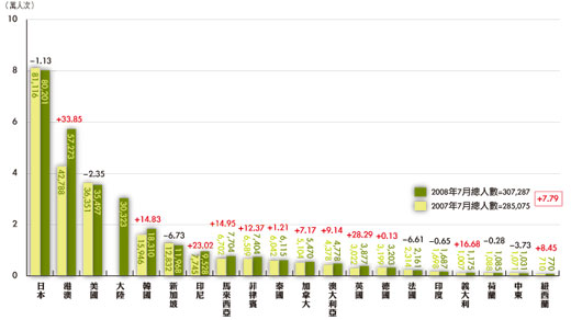 2008年7月來台旅客為30萬7,287人次,與去年同期相較,成長7.79%。其中「觀光」目的旅客13萬1,359人次,成長16.50%,「業務」目的旅客7萬2,769人次,負成長6.09%。