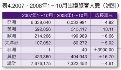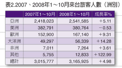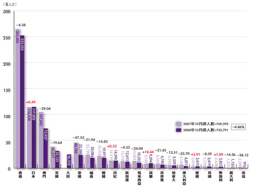 2008年10月來台旅客為32萬7,038人次,與去年同期相較成長3.98%,而1~f0 10月總累積達3,165,925人次,成長了4.98%。10月來台旅主要客源市場前5名人次及成長率分別為:日本9萬5,234人次(-4.21)、港澳4萬3,030人次(+17.73)、中國大陸3萬4,780人次、美國3萬3,744人次(-4.93)、韓國1萬7,392人次(+12.34),名次順序與上個月相同。