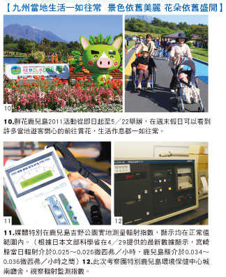 國土交通省九州運輸局企劃觀【九州當地生活一如往常 景色依舊美麗 花朵依舊盛開】光部長河原畑徹表示,2009年台灣到九州的旅遊人口約6萬人(2010年尚未公佈);此次發生大地震後,雖然宮崎距離震央達 1000公里以上,但對當地觀光影響的幅度達到50%以上;此次九州也希望透過台灣媒體把第一手報導傳回去,讓台灣民眾都知道九州的一切都正常運作。河原畑徹說,他期待台灣旅客盡快來旅遊,這就是對九州最大的幫助。目前宮崎觀光會議協會暨鹿兒島觀光聯盟已率先決定於5╱17 在台北舉辦商談會,而九州的 7個縣廳也正規劃5月要來台宣傳。九州觀光推進機構海外誘致推進部部長武田誠一也透露,九州預計會在5月中旬會來台宣傳,在6月也將來台舉辦教育旅行說明會,11月來台參加ITF。