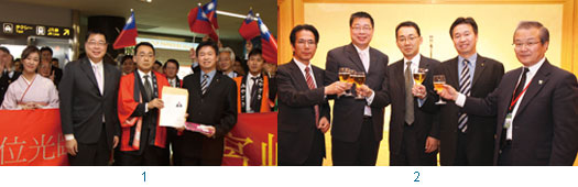 1.華航南九州關懷之旅考察受到九州政府機構及當地業者的熱烈歡迎。汎佳旅行社副總經理梁廷佑(右)、國土交通省九州運輸局企劃觀光部長河原畑徹(中)、華航台灣地區行銷協理李献光。2.(左起)宮崎縣商工觀光勞動部觀光交流推進局局長安井伸二、汎佳旅行社副總經理梁廷佑、國土交通省九州運輸局企劃觀光部長河原畑徹、華航台灣地區行銷協理李献光、宮崎縣觀光交流協會事務理事石野田姓藏。