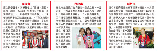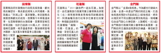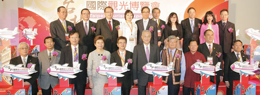 ▲2011台北國際觀光博覽會於5╱13盛大登場,開幕由(前排左起)華航台灣區處長兼台北分公司總經理余劍博、Antor聯誼會會長施春庭、台北市副市長陳威仁、交通部觀光局局長賴瑟珍、台北市旅行商業同業公會理事長許禓哲、行政院院長吳敦義、行政院原住民族委員會主委孫大川、苗栗縣縣長劉政鴻、新竹市長許明財、日本觀光廳次長武藤浩。復興航空營運副總經理李士勳(後排左2)、(後排左5起)長榮航空客運本部協理陳啟弘、日本航空支店長多田利郎、台北市觀光傳播局局長趙心屏(後排右2)與旅遊局、公協會貴賓共同剪綵。