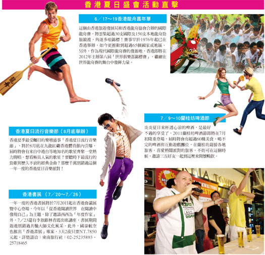 6╱17~8╱31香港旅遊發展局要給旅客打造一個全城狂歡的盛夏,「香港夏日盛會」集合了夏季熱爆全城的繽紛元素,旅客不但可以在購物商場和百貨公司專享消費優惠,亦可參與連串精采活動:包括既熱鬧又刺激的「香港龍舟嘉年華」、雲集人氣歌星及組合的音樂盛會「香港夏日流行音樂節」、緊張有趣兼備的「香港購物王」大賽,以及「蘭桂坊啤酒節」等多個大型活動。