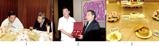 1.台北福容大飯店副總經理沈中啟(右)與首發團貴賓左力平相見歡。2.麗寶機構董事長吳寶田(右)餽贈台灣茶葉給首發團貴賓左力平。3.台北福容大飯店推出的台灣美食宴。(圖片提供>台北福容大飯店)