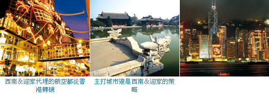 西南﹠迎家國際(綜合)旅行社一般常聽到歐洲旅遊有所謂的雙城搭配行程,除了因為歐洲飛航時間長,所以盡可能短時間多遊覽幾個景點,且歐洲城市性格異中有同,搭配遊覽更能領閱箇中精華與變遷。中國旅遊方面,頂多是同一省分距離相近的城市,一起包含在行程中,大多是單純的串聯,較少主題突顯。但西南&迎家旅行社在大陸行程開創上,採用雙城搭配模式已行之有年,最主要還是來自於有效運用所代理的航空公司優勢,從中規劃出來的創意路線。