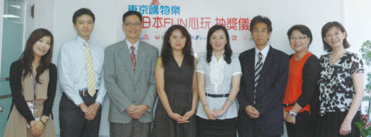 「東京購物樂,日本FUN心玩」抽獎活動於日前圓滿落幕,交流協會期待能儘快與大家有進一步的合作機會。(左起)復興航空廣宣室專員方佳雯、日本交流協會台北事務所經濟部主任(觀光擔任)山田敬也、華航台北分公司行銷策劃部黃秉勤、全日空台北支店總務梁韻琪、復興航空廣宣室經理陳玟玲、日本航空台北營業處旅客業務部部長山戶博司、日本交流協會台北事務所經濟部(觀光擔任)黃玉雲與日本航空台北營業處旅客業務部經理方曼麗。