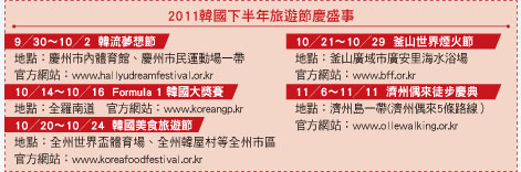 目前韓國觀光公社在8月與韓亞航空、釜山航空及業者合作推出「韓楓縱貫線」團體產品,讓旅客可感受從首爾、釜山交叉進出,感受不走回頭路的便利;與長榮則會針對自由行規劃推廣活動;以往韓國觀光公社與華航一直有大型推廣活動的合作,接下來也會持續進行。值得一提的是,韓國觀光公社正積極爭取延續台灣往返濟洲的航班,希望能有更多旅客體驗韓國人最愛的度假島嶼。此外,大韓航空即將於11月開航台北清州,屆時台灣旅客前往韓國更添一大選擇。