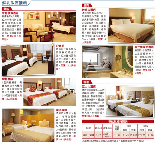 為了讓同業認識全新航點鹽城的產品資源,華航於7╱19~23 舉辦鹽城蘇北考察團,邀請「最愛中華」PAK的5家旅行社業者及媒體親自前往當地,以南京為進出點,走訪包括鹽城、連雲港、宿遷、淮安等主要城市,此次近1,000公里以上的考察路線,幾乎將整個蘇北繞了一圈,不僅蘇北遊程走得相當紮實,也帶回多家飯店與景點資訊。