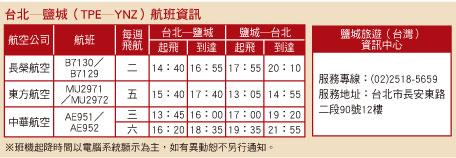 有「東方溼地之都」及「神鹿仙鶴故鄉」美譽的江蘇省鹽城市,繼2010年10月副市長周福蓮來台展開「鹽台鄉村旅遊合作懇談會」後,今年5 2鹽城市旅遊局局長史學健率團來台進行為期一週的「鹽城旅遊活動週」、簽訂鹽城旅遊推廣合作協議,7 25台旅會北京辦事處赴鹽城舉辦「台灣觀光旅遊說明會」,兩地往來熱絡;繼至9 7台灣─鹽城即將開航前,在台成立「鹽城旅遊(台灣)資訊中心」,設置常駐型服務窗口,對此航線開通與經營台灣市場的用心可見一斑。