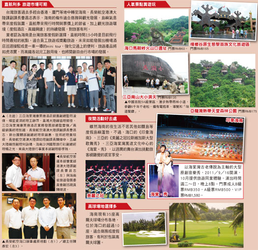 海南是中國唯一的熱帶島嶼省份,有業者說:「中國有幾個非去不可的地方,海南島就是其中一個。」無論旅客熟悉大陸旅遊其他景點與否,初到海南,躍然入目滿是南方海島風情搖曳的椰樹,時刻被金燦陽光、白淨沙灘和碧藍大海包圍,讓人幾乎要誤以為正在東南亞熱帶島嶼度假。