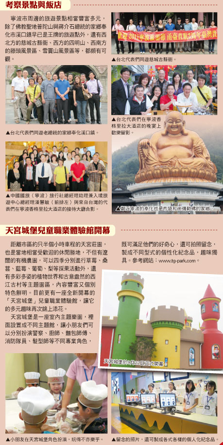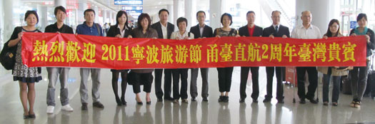 為了慶祝台北、寧波直航航線開闢屆滿2周年,寧波市政府與寧波市旅遊局特別廣邀台灣與寧波兩地的相關業者齊聚,一方面宣示今年的「寧波旅遊節」正式起跑,一方面發布這兩年來兩地合作的旅遊成果,並商討今後共同努力的方向。在中國東方航空台灣分公司客運銷售部主任胡若蘭的領軍下,台北共有行家、西南、南龍、五福、康福、雄獅、中安、中國海外、金廈、浦東等 10餘家業者代表前往,除了參與會議研討外,並在中國國旅寧波分公司的熱情安排下,考察當地旅遊資源,為日後的合作再打下穩固的基礎。