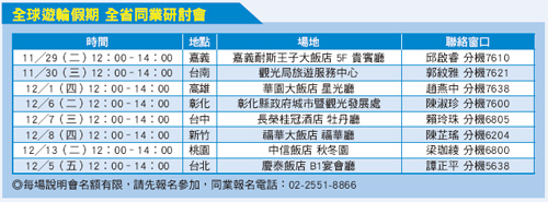 歐洲行程設計更為多元,短天數有西、東地中海10日,另外還可延伸西班牙、義大利深度陸地行程至15、17 日。長天數有西、東地中海15日、聖地15日,特別推薦明年全新下水「精緻遊輪水映號∼華麗地中海.東西全覽17日」。歐洲免簽證優勢持續發燒,明年勢必再創銷售新高。