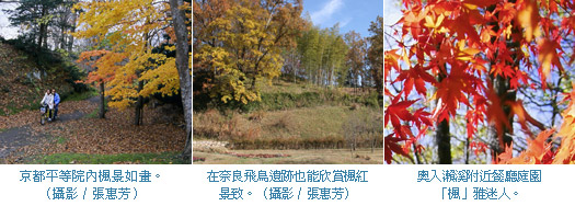 京都地區為東福寺以及總本山的永觀寺、禪林寺,推薦觀賞時間為11月中旬至下旬。在東福寺的本堂與開山堂之間「通天橋」上,可眺望由2000株楓樹點綴溪谷所構成「通天紅葉」震撼美景。而永觀寺素來以賞楓勝地聞名,每年搭配楓紅還有夜間照明,更是絕美。至於奈良地區則力推談山神社,觀賞時間較晚可至12月上旬,神社因設有世界唯一現存的木造「十三重塔」而被列為重要文化資產,極具參觀價值,加上3000株紅葉樹烘托出火紅秋季景致,錯過可惜。