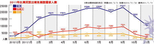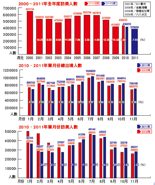 引頸企盼已久,終於在2011年末由美國在台協會(AIT)代理處長馬怡瑞(Eric H. Madison)正式宣布台灣獲提名為美國免簽證計劃的入選國,雖然 AIT表示尚無明確的時間表,不過,計算觀察期時間,最快可能於今年7∼8月間生效,此一消息於12 22公佈後,大舉振奮人心,旅遊業者包括航空業、旅行社、甚至美國各州觀光局對此均釋出正面回應,完全看好下半年出境美國的旅遊市場。