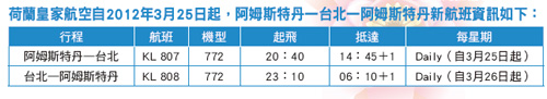 溫爾功表示飛行時間節省到1 2 ∼ 1 3 小時, 此外, 機型也從7 4 7 調整成新的7 7 2,座位數從過去2 7 5增加為3 1 8 (35C╱283Y),加上「晚去晚回」的時間帶,相信對旅客很有吸引力。另外,抵達阿姆斯特丹後,幾乎所有航點都能當天運載飛抵,對於轉機旅客更是十分方便。溫爾功看好今年台灣赴歐旅遊市場仍會成長,一大因素在於台灣景氣與全球相對較好,而歐元匯率較低,加上荷航直飛以及座位數倍增,將一改過去機位取得有限的情況,因此希望將此產品透同業協助推廣,提高市場知名度。