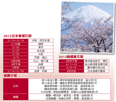 3月開始,九州櫻花最先開,搭乘華航 C I116 117福岡進出,5天行程九州全覽,純賞櫻加泡湯,一舉蒐羅太宰府天滿宮、湯布院、血池地獄、宮崎神宮、平和台公園、飫肥城、鹿兒島城山公園、霧島神宮、水前寺成趣園等賞櫻名所,無論是吉野櫻、山櫻或是八重櫻,一次看個夠,搭配霧島溫泉、阿蘇火山溫泉SPA,無比暢快。福岡今年團量已現,華航也開加班機,能有效利用。