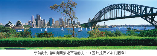事實上,新航對於推廣澳洲旅遊不遺餘力,自2005年3月開始,新航陸續與澳洲昆士蘭省、澳洲政府與南澳旅遊局簽訂合作備忘錄,透過共同行銷活動向全世界推廣澳洲旅遊,今年5月甚至宣布擴大與南澳旅遊局協議推廣南澳觀光的合作計畫,推廣經費倍增至30萬澳幣(約新台幣750萬元)、合作期間也將延長1年至2007年10月31日。