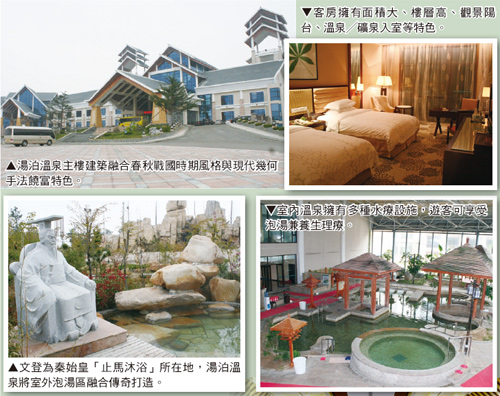 湯泊溫泉總經理王瑛表示,溫泉樂園更傳承中西養生理論,精心打造極富特色的溫泉浴池,既有增強體魄的運動型衝浪池與富有情調的天然溫泉池,也結合中醫及溫泉理療配制而成的功能葯浴池與先進的水療溫泉池,並擁有獨特的溫泉文化泡浴區,將溫泉文化與時尚需求完美結合。