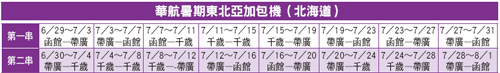 華航台北分公司客運營業部副理姜紀中表示,由於日本線3月底已增班,所以因應暑期市場,只有北海道2串加班機,暑期經營北海道兩點進出包機行程:函館與帶廣、函館與千歲、千歲與帶廣,彌補千歲每天1班的不足,北海道暑期航班供應量將非常充足。