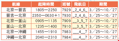 在自營航線部分可分別由北京、杭州、大連、太原、廣州、蘭州、海口、西安、合肥飛航至台北、釜山、普吉、曼谷、新加坡;包機部分可由北京直飛沖繩、馬列,以及海口飛南寧至曼谷,經由與香港航空(HX)、香港快運(UO)之共碼航班可飛抵至香港等城市。其中,由北京起飛的大陸航線超過45個。