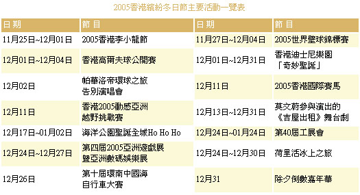 今年邁入第四年的「香港繽紛冬日節」,從2005年11月25日正式開跑,直到2006年1月2日,台灣以「愛戀浪漫香港」為推廣重點,主推偕同伴侶前往香港共度聖誕佳節。尤其是全新開幕的四季酒店、置地文華東方酒店以及香港迪士尼,皆為冬日持續發燒的熱門行程。