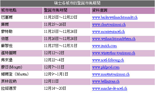 四季分明的瑞士,各季旅遊的重點大不同,瑞士國家旅遊局台灣區代表盧筱筠表示,由於國人對於滑雪活動不太熟悉,加上對歐洲冬季冰天雪地的既定印象,不太習慣在冬天前往瑞士旅遊。其實,冬遊瑞士除了能夠嘗試刺激的雪地活動外,各城鎮也因為冬季節慶而裝飾得有聲有色。