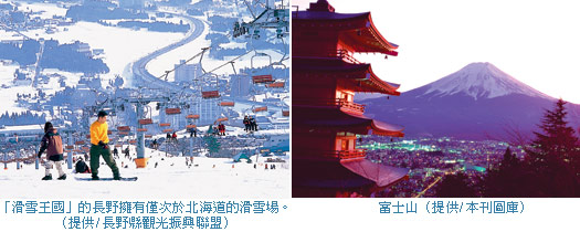 長野縣觀光振興聯盟主查中澤修二表示,身為滑雪王國的長野縣,向來就是日本知名的滑雪勝地,縣內多達12處的滑雪場,即使不諳此道的遊客也可搭乘纜車,勝覽整座山光美景。縣內有多達320處的溫泉,日本頗富盛名的特殊景觀獼猴溫泉,也是長野縣特殊景點之一;而生長在溫泉周圍的「野澤菜」,其做成的泡菜更是聞名全日。