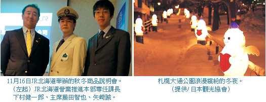JR北海道這幾年針對個人市場積極地來台推廣,延續去年第1次參加台北國際旅展,今年則以更多的秋冬新商品介紹給台灣的業者與媒體。JR北海道營業推進本部營業部下村健一郎課長表示,2010年JR北海道希望台灣旅客可以達到9萬人潮,未來,隨著台灣人的北海道市場漸趨個人化,JR北海道未來也將分季節推出更多優惠的商品。此外,JR北海道為了讓旅客在購買乘車券可以更為便捷,所以希望台灣的旅行業者與媒體,在使用到JR北海道的列車名稱時,可以統一使用JR北海道規定的英文列車名。