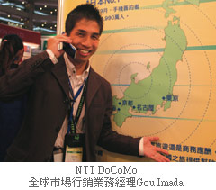 日本NTT DoCoMo今年特色參展的目的,就是為了宣傳台灣用戶只要利用3G手機,即可原卡原號漫遊日本;NTT DoCoMo全球市場行銷業務經理Gou Imada表示,從去年6月到目前為止,國內的中華電信、遠傳電信以及台灣大哥大已陸續完成與日本當地基地台簽約合作模式,讓消費者無須轉換日本手機或門號,受話地域不再受限,只不過目前僅適用3G手機,2G手機則不可通行。