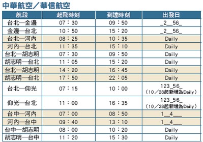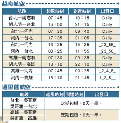 目前可利用華航、長榮、越南航空與越南的兩大機場─河內與胡志明市進行連結,若要串聯中越行程,也多以河內、胡志明市做為起始點,再以越南國內航段或拉車方式,連結中越的順化、峴港、會安、芽莊、大勒等景點。看好中越商機,遠東航空也規劃在近期以包機方式直飛峴港,提供更加便捷的航班選擇,相信在未來將會讓中越持續加溫。