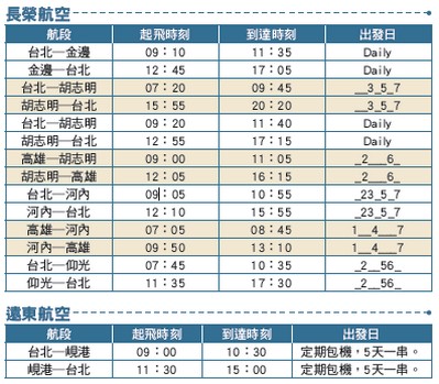 華航目前台北─仰光每週飛航一、二、三、五、六,並且預計於10╱28增加為 Daily,長榮航空也將從10╱9開啟每週二、五、六的台北─仰光飛航服務,藉由直航航班,勢必可以提供更加便捷的旅遊產品,同時藉由產品的新鮮感,帶動中南半島整體的旅遊知名度。