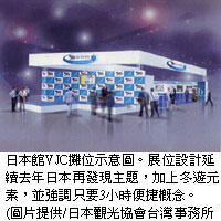 展位面積蟬連國外單位之冠的日本館,北從北海道、南至沖繩,四大島區都熱情參與,顯見台灣確實成為日本最重視的海外遊客。同屬東北亞的韓國今年展位比去年增加兩倍多,充分感受到爭取台灣遊客的企圖心。新加坡主打樂活概念,從花園城市轉型為具有時尚感的有機國度,而澳門則巧妙結合賽車與名列世界遺產的歷史城區的互動遊戲,精采可期。