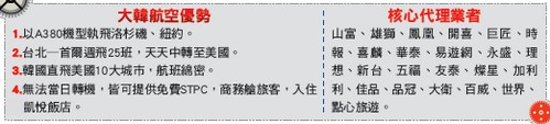 郭湘芩強調,大韓航空所有飛美國航班皆為直飛、不中停,而且回程轉機時間漂亮,熱門的夏威夷去程皆可當日銜接、回程週一、四、五、七可當日轉,亞特蘭大則來回程都可當日轉機。若是無法當日轉機,於淡季期間所有艙等(不含團體及免費票)皆可提供免費STPC,而選搭商務艙之旅客,無條件提供並入住凱悅飯店。此外,在洛杉磯與紐約部分,更是以大韓航空最引以為傲的A380機型執飛。