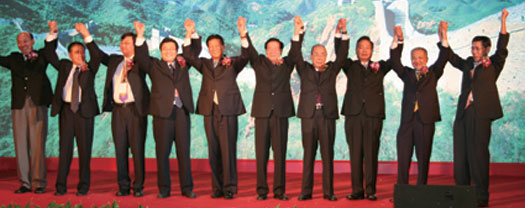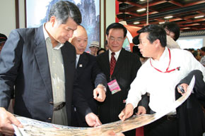 交通部常務次長何煖軒(左1)與觀光局局長許文聖(左2)在台灣觀光協會會長張學勞(左3)的陪同下,參觀「海峽兩岸台北旅展」所有大陸參展攤位,期間巧遇正在展攤上向台灣民眾推薦貴州山水風光的貴州旅遊協會副會長傅迎春,雙方除了熱烈寒暄、祝賀之外,傅迎春副會長立即拿出造成民眾熱烈索取的貴州風光地圖向何煖軒次長介紹貴州,更立即邀請次長何煖軒與局長許文聖到貴州一遊,親自體驗貴州秀麗景致。(攝影/林柏成)