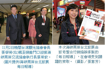 2006年11月,「海峽兩岸台北旅展」不僅是旅遊業的大事、盛事,更是神祕、心動的第一次!分為東北、華北、華東、西北、西南、中南等六大區塊,加上航空公司、旅行社的盛大陣容來台參展,在B區內可見到各展館的用心雕琢,不時出現的北京奧運福娃也令人感到驚喜,更可從文宣品的製作感受到大陸參展單位對於推廣旅遊的用心與卓見,本期推出「海峽兩岸台北旅展」的全收錄,也為兩岸旅業的再進一步作紀錄與鋪路!