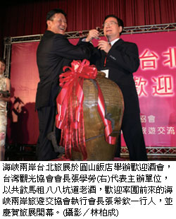 去年此時,張希欽陪同海峽兩岸旅遊交流協會會長邵琪偉抵台參訪,當時邵琪偉就曾表示希望與台灣民間旅遊組織進行協商,進一步推動兩岸對等旅遊,而1年後順利邀請大陸32個省市的旅遊代表來台參展,台灣觀光協會會長張學勞除了致上歡迎之意,更表示,「經過3年的努力,終於爭取邀請讓對方來台設展,這雖然是兩岸事務上非常小的一步,卻是觀光旅遊業發展的一大步。」