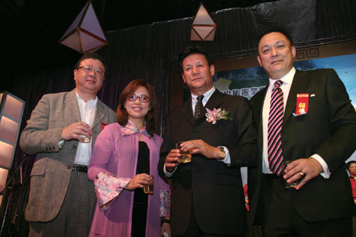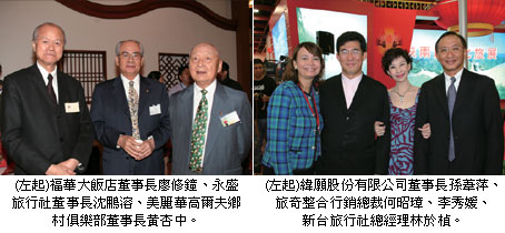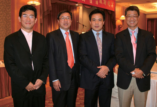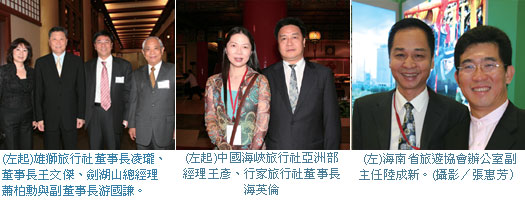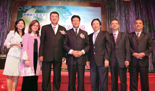 珠江船務董事副總經理張道武(左3)與海峽友誼集團董事長劉賢賢(左2)表示,2008年海天聯運年處理量將達到6百萬人次,其他如行李直掛、航站大樓擴建為綜合娛樂城…等計畫都將逐步實現。在兩方共同舉辦的感謝晚宴中,國泰航空行銷部經理凌維謙(右1)、旅奇整合行銷總裁(左1)亦為座上嘉賓之一。(攝影/張惠芳)