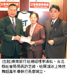 東南旅行社總經理李清松表示,演出尤其以「力技」、「形體技巧」、「高空節目」為人稱許讚嘆,同時,表演中在冰上滑行、流動的絕妙平衡,呈現出的感動難以筆墨。而東南旅行社為回饋社會,特別捐贈1,000張門票給台北縣政府社會局,提供貧苦家庭或身心障礙者也有機會蒞臨現場。「哈爾濱冰上特技舞蹈嘉年華」台北場12/6~12/18、高雄場12/23~2007/1/3,票價依不同區域為600~1,200元,同業11/20前訂購預售票可享特別折扣。