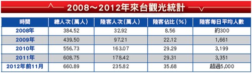 來台旅客人次從2007年的372萬人次,2008年的384萬人次,2009 年的430萬人次,2010年的550萬人次,直到2011年增至608萬人次,今年來台旅客已在12╱18達700萬人次,預計2016年更可望創造1,000萬人次的佳績。