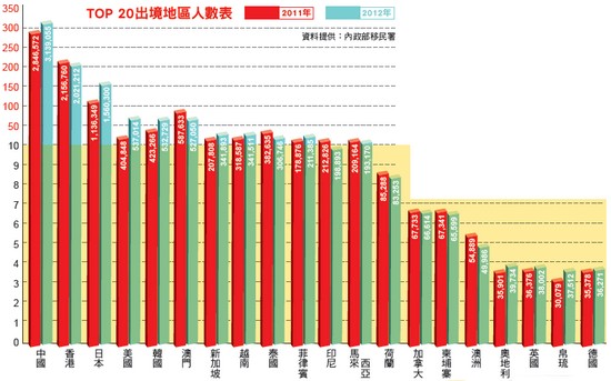 台灣旅客出境人數於2010年首度突破900萬人次大關,達942萬人次;2011年再增至958萬人次;2012年首度破千萬,成長6.84%,即約2個台灣人之中就有1個人前往世界各地旅遊,其中以前往日本旅遊的旅客成長幅度最大,達到 37%之多;其次為韓國成長13.46%;新加坡的16.4%居第3名。