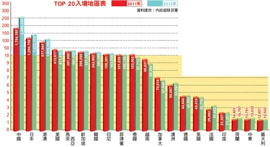 此外,主要客源市場來台人次亦創新高,其中大陸市場來台旅客258萬6,428 人次,成長幅度達到44.96%,不論人數與成長幅度均居各客源市場之冠;而港澳市場也不遑多讓,以101萬6,356人次,成長24.26%居大幅成長市場中居次。預估2012年觀光外匯收入將可達到新台幣 3,400億元。