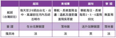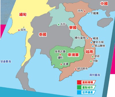 越南也是觀光業發展最成熟的中南半島國家,就飛機航班而言,台灣北中南各地飛往胡志明市、河內等的航班,一天最少8班,其中中華每天飛兩班胡志明市及河內。另外值得一提的是,越南航空的對未來發展藍圖的架構,也反應這個國家經濟成長的規畫。旅遊,旅客也可以在吳哥窟租摩托車、騎單車等。