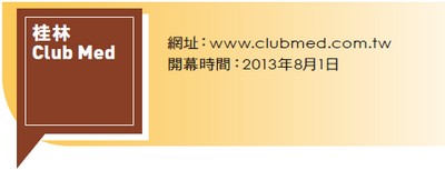 度假村頂級品牌Club Med在全球有數十個據點,今年8月1日將在中國推出第二個,也就是位於桂林的亞洲第一座自然山水型度假村。桂林Club Med占地約46公頃,位於「山青、水秀、洞奇、石美」的廣西壯族自治區,坐擁50座環繞四周的連綿山嵐,由於位處陽朔及桂林的中間點,前往當地各著名景點相當方便。園區內還有包括朱銘在內超過150位國際知名藝術家的作品,強調的是山水與人文之美兼具。330間客房幾乎都能觀賞度假村內之優美山水景觀,還有46間各具不同藝術設計主題的房間,包括由知名藝術家A-Kan設計的雕塑主題客房。