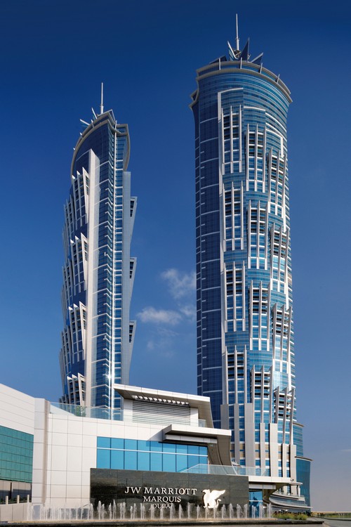 高達355公尺的大樓,萬豪系列的新酒店JW Marriott's Marquis Dubai雖然比不上一旁的哈利發塔,但是仍然榮登世界第一高飯店的頭銜。這個由阿聯酋航空集團持有的酒店,設計上全部走頂級路線,由兩棟72層的大樓組成,大樓頂端各有鑽石狀巨型燈飾,閃耀出不凡的貴族氣勢。兩個大樓各有804個房間,雖然風格多變,但走的都是奢華路線,外頭還有占地4,000平方公尺的Spa與健身俱樂部,以及30公尺長的露天泳池等。酒店瞄準潛力強大的MICE市場,距離杜拜國際金融中心、國際會展中心僅約5分鐘車程,而且還有可容納千人的會議廳。到了夜晚,可以到酒店71至72樓,這裡有盡覽杜拜全景的雞尾酒酒吧,或是到延攬米其林星級印度名廚Atul Kochhar主持的知名餐廳Rang Mahal大快朵頤,也可以到從阿拉伯絲綢商隊擷取靈感的Saray Spa,體驗著名的牛奶蜜糖、阿拉伯咖啡等療程,讓人心神完全放鬆。